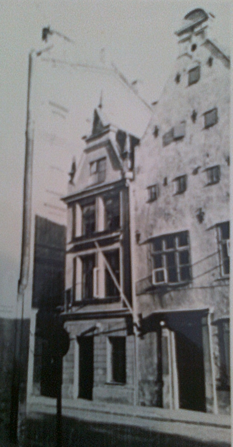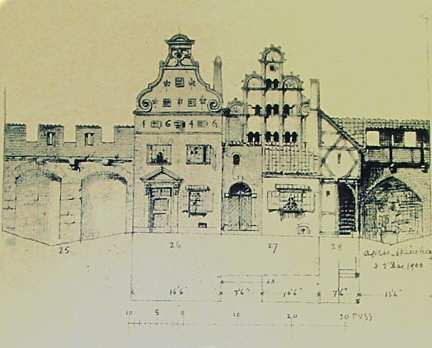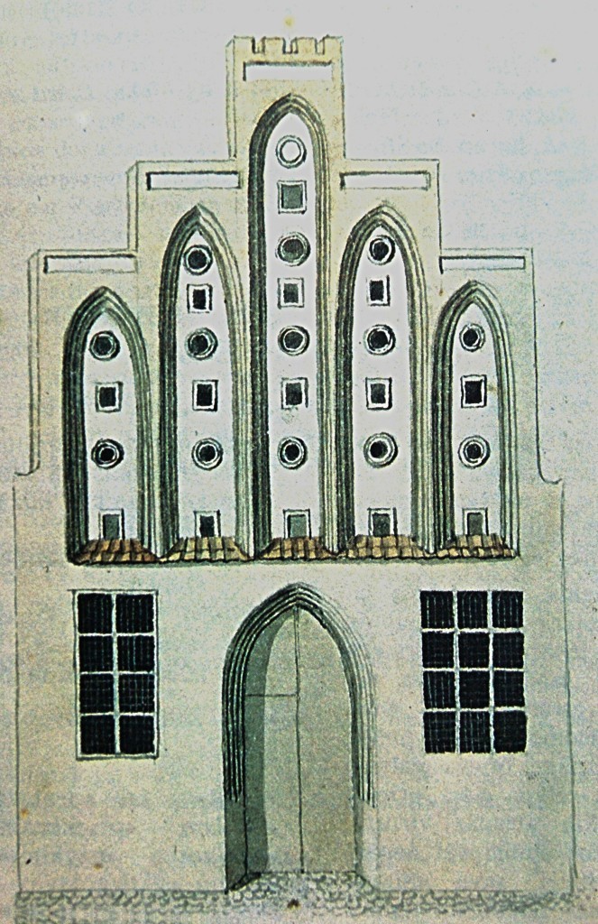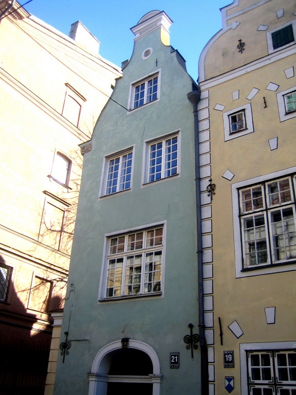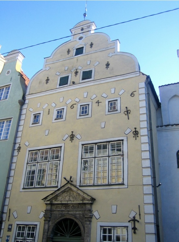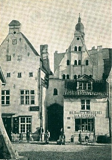 Старший брат, бывший дом каменотёса Шрадера, построен в XV веке. Тогда дома стояли не на красной линии улицы, а имели небольшую предвратную площадку. У входа устанавливали красивые каменные стелы, с изображением гербов или эмблем. Это были первые опознавательные знаки дома. Фронтоны домов XV века были ступенчатыми – самый простой способ подстроить фасад под крутые скаты крыши. Дело в том, что в те времена жили только на первом этаже здания, где была одна общая комната с дымоходом и пристроенные к ней каморки, а на верхних этажах находились склады, которые выстраивались пирамидой. Прибалтика, как и всё побережье Балтийского моря, не отличалось хорошей погодой, поэтому такое строение дома было идеальным для отвода обильных осадков.