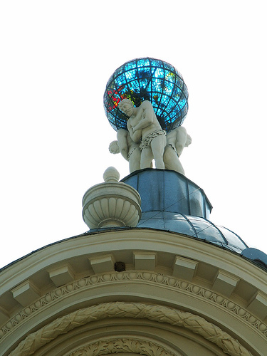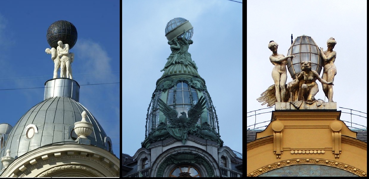 Три могучих фигуры несут на своих плечах большой земной шар – классический мотив античной мифологии, хотя там атлант был всё-таки один и держал он на своих плечах не земной шар, а небесный свод. А вообще стеклянные шары, поддерживаемые различными мифологическими персонажами, часто встречаются в архитектуре эпохи модерна, вспомнить хотя бы дом Зингера на Невском Проспекте в Санкт-Петербурге (символично, что сегодня в этом здании находится «Дом книги» – крупный книжный магазин города) или здание отеля «Европа» в Праге. Но в отличие от этих скульптур рижский шар-глобус сделан из цветного стекла и ночью подсвечивается, так что это своеобразный круглый витраж. В начале века, да и теперь, это было настоящим прорывом в оформлении зданий. К сожалению, после последней реставрации скульптуры в 1988 году он стоит немного криво, но восприятию скульптурной группы в целом это обстоятельство не сильно мешает.