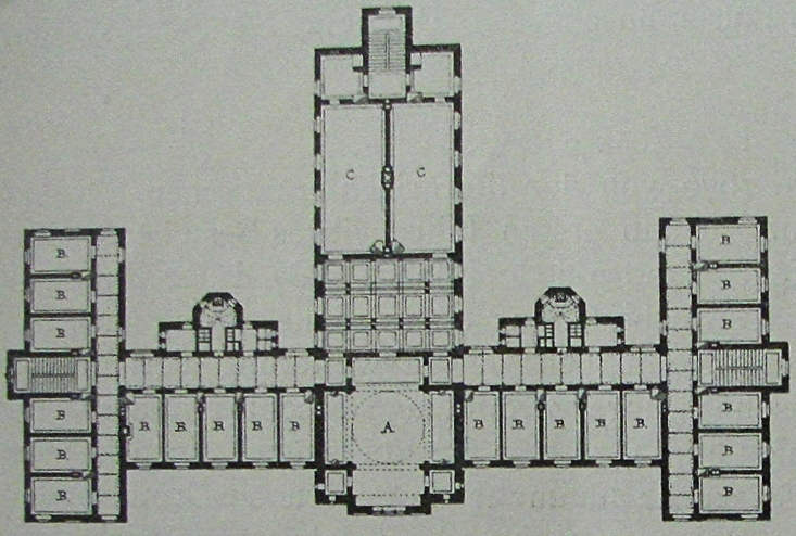 Сверху богадельня напоминала букву «Т». В главном корпусе, на нижнем этаже, находились просторные классы для школы. Обучение в то время было раздельным: справа были классы для мальчиков, слева – для девочек. В малом корпусе находилось 12 комнат для постояльцев и комнаты эконома и администрации. На втором этаже расположилось ещё 22 комнаты на две кровати каждая для постояльцев, два просторных столовых зала и церковь. На третьем этаже также были общие комнаты для постояльцев. В подвале здания расположились кухня, пекарня, кладовые и прачечная. Открытие богадельни состоялось 14 декабря 1876 году, в день Св. Мученика Фирса. Школа для мальчиков начала свою работу в 1880 году, а год спустя и для девочек. Детей учили читать и писать.