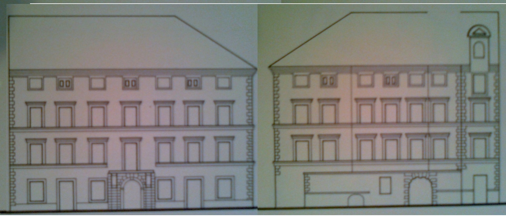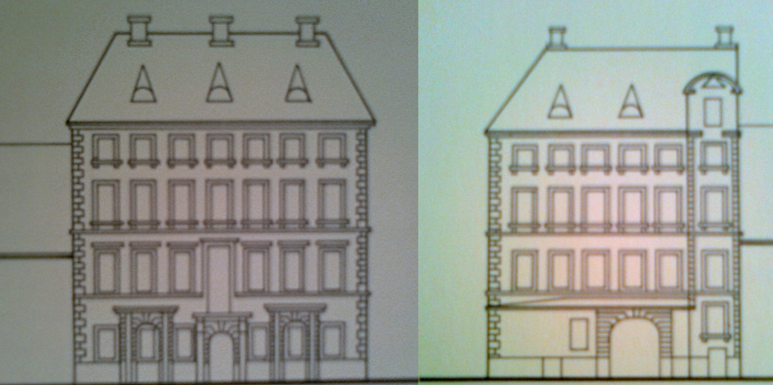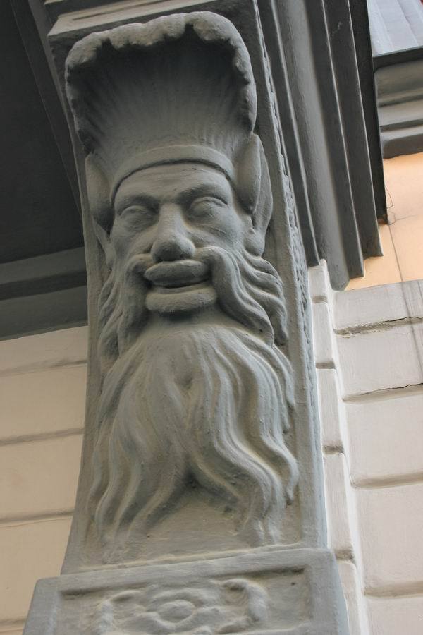 Сначала по проекту архитектора Гесса был полностью переоформлен фасад: пропали два боковых портала по улице Пилс, на первом этаже появились широкие окна-витрины. Балкончик над входом украсился декоративными консолями с изображением бородатого старца с ослиными ушами. В нём безошибочно угадывается фригийский правитель Мидас, чьё прикосновение превращало всё в золото. Его изображение появилось здесь, возможно, неслучайно. В греческом мифе о царе Мидасе ослиные уши символизируют невежество и глупость того, кто придает слишком большое значение материальным благам, богатствам этого мира. Во многом этот образ схож с фигурой Александра Даниловича Меньшикова, «вороватой, но верной руки» Петра Великого.