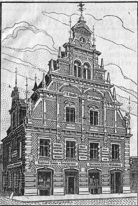 Объявление фирмы «Х.П. Швабе» и дом Черноголовых в 1886 году