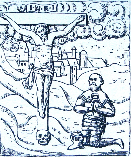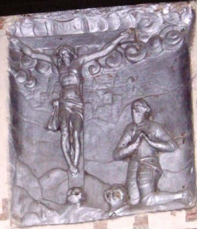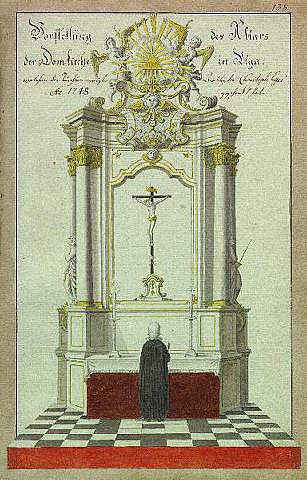 Итак здесь тоже изображён рыцарь, но уже не в доспехах, а в светской одежде: в кафтане, штанах и сапогах, на поясе у него висит шпага, у ног его всё так же шлем. Рыцарь стоит на коленях, но уже не в чистом поле, а перед распятием, которое стоит на алтаре в церкви. Интересно, что похожее распятие было и в рижском Домском соборе, вот рисунок Иоганна Бротце:
