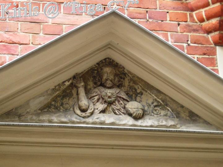 Но и это ещё не всё. На улице Вецпилсетас 8 сохранилась эпитафия, вернее её фрагмент, так же конца 16го начало 17го века. И на ней изображен Христос, всё точно так же: