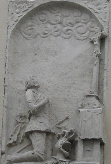 Предлагаю Вам свое видение барельефа с коленопреклоненным рыцарем.На нём изображен заказчик барельефа над входом в монастырь премонстерианцев при дворянском домском соборе.Он изображен в молитве перед распятием Христа на Голгофе.За его спиной крепость-Иерусалим.У подножья Креста Глава Адама на которую по преданию пролилась искупительная кровь Христа и искупила первородный грех Адама.Слева от распятия,что не видно на рисунке Неймана и Вашей фотографии полусидящая нераскрашенная фигура монаха премонстерианца молящаяся за рыцаря.Недостатком описания Неймана является то,что барельефы созданы при монахах католиках,а он будучи протестантом не имел уже даже представления о размещении скульптуры в католических монастырях.Я утверждаю,что этот барельеф не фрагмент эпитафии,как утверждает Циелава,а именно специально сделанный для входа в монастырь барельеф.По католической традиции всякий вход в значимые части сакрального здания украшались фигурами святых,Ангелов,или Христа,часто благославляющих.Затем эта традиция перешла и на гражданские здания примеры этому мы видим и в Риге.Дом Данненштерна,Дом Ретерна,представленный на Вашей фотографии дом на ул Лайпу.Более того барельеф с распятием у входа в монастырь с улицы Яуна и Благословляющая фигура Христа в крестовой галерее Домского собора связаны между собой тем,что находятся над входами в помещения Домского капитула одна из монастыря,а другая с улицы. С уважение Александр Петрович Сенькан.