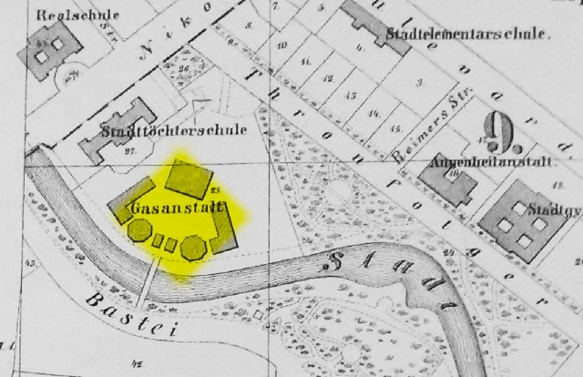 Лишь в 1857 году, вместе со сносом городских укреплений, неожиданно нашлось место для газовой фабрики – на бывшем Яковлевском равелине, который в то время ещё был островом в городском канале. Кюннель разработал новый проект газового завода, который на этот раз нашёл поддержку у министерства. И 12 июля 1861 года был торжественно заложен первый камень в основание первого в Риге газового завода. Фасад газового завода спроектировал городской архитектор Иоганн Даниель Фелско в стиле неоготики. Получилось величественное здание, напоминающее настоящий средневековый замок времён династии Тюдоров с башенками и зубчатыми фронтонами и стенами. Все строительные работы обошлись казне в 297 тысяч рублей и были завершены 6 августа 1862 года.