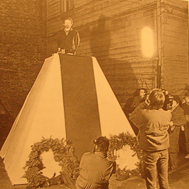 Рядом, покачиваясь от порывов ветра над землёй, парит макет фасада здания. Минута молчания. На трибуну поднимается поэт Андрис Бергманис.