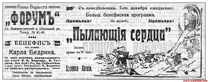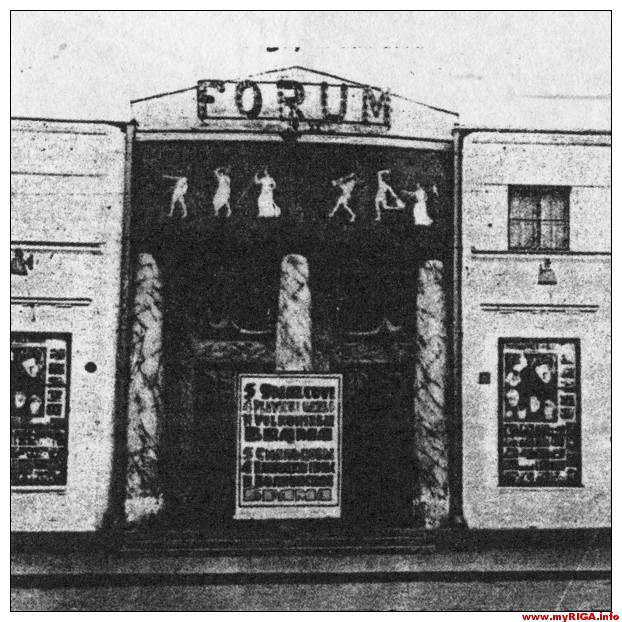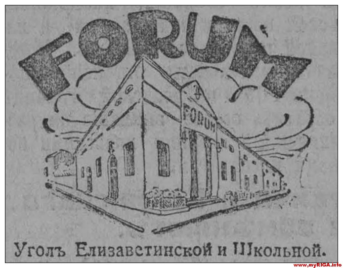 Нельзя не отметить, что 1923 год стал годом качественного скачка в истории развития рижского кинематографа. Опытные кинопредприниматели Андрей Керре и Василий Емельянов, совладелец будущего фешенебельного «Сплендид Палас», первыми уловили пульс эпохи, который настойчиво сигнализировал, что Великому Немому стали слишком малы «старые пеленки» кинозалов довоенных лет. Кинематограф вырос, встал на ноги, набрал силу, и не мог больше ютиться на правах бедного родственника в приспособленных помещениях жилых домов и хозяйственных постройках. Бум строительства отдельных каменных кинотеатров нового типа докатился до Риги. Первенцем стал кинотеатр «Форум» с его переосмысленным и взятым на вооружение театральным антуражем минувших времен и новыми архитектурными формами. В фасаде перестроенного здания ресторана со стороны улицы Элизабетес прослеживались черты классицизма. Портик образовывали три выпуклые колонны, а фронтон украшали благородные львы. Чем не театр?