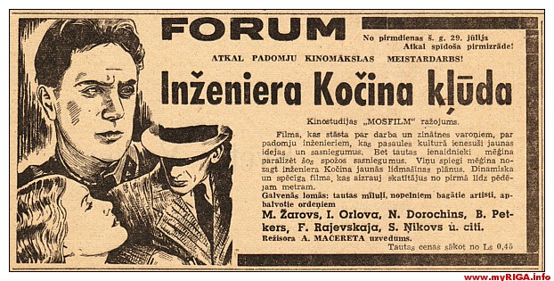 Наступил 1940 год. Репертуар рижских кинотеатров существенно изменился. Героев слезливых мелодрам и лихих ковбоев на экранах сменили люди труда, закаленные в борьбе и строительстве социализма. В кинотеатре «Форуме» одном из первых стали демонстрировать исключительно советские фильмы. На первых порах социалистическая по определению кинореклама по духу и форме мало изменилась: «С понедельника 5 июля выдающаяся премьера фильма «Трактористы». Производство московской киностудии «Мосфильм». Это самый веселый фильм этого года! Все, кто были в восторге от фильма «Песня о Волге», придут в еще больший восторг от фильма «Трактористы»! Это симфония напора музыки, песен, жизнерадостного настроения и рабочего духа. Кроме того, традиционный первомайский парад в Москве 1940 года. Начало сеансов в 18, 20 и 22 часа. В воскресенье в 16, 18, 20 и 22 часа». Или другое объявление: «Выдающаяся художественная премьера!!! «Человек с ружьем». Всем следует посмотреть этот фильм! У всех останется незабываемое впечатление». Далее в кинотеатре «Форум» показывали «Волочаевские дни» (1937 г., режиссеры братья Васильевы), «Путь на Петроград закрыт», «Белеет парус одинокий» (1937 г., режиссер В.Легошин), «Моя любовь» (1940 г., режиссер В.Корш-Саблин), «Девушка с характером» (1939 г., режиссер К.Юдин) и другие советские фильмы.