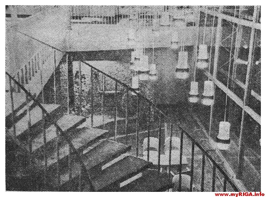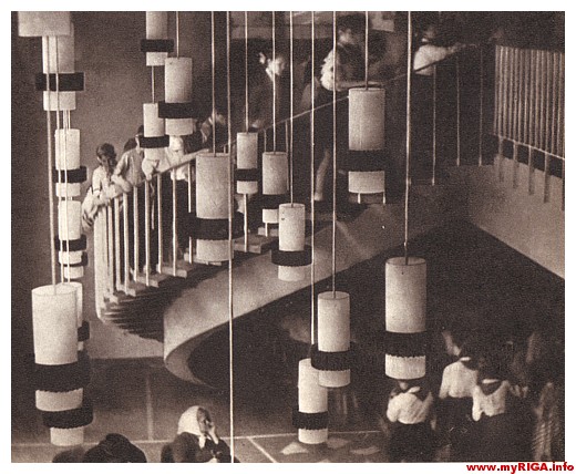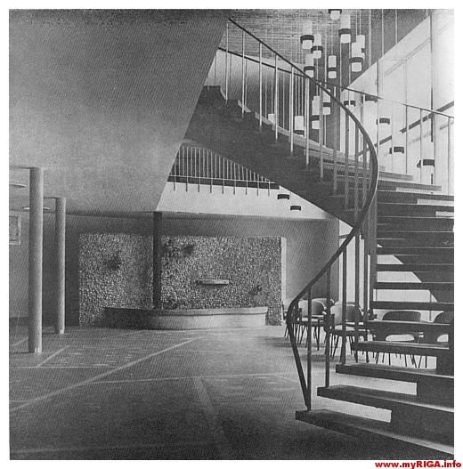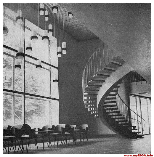 «Интересно выполненная винтовая лестница» вызвала немало споров на этапе строительства. Ее предлагали заменить обычной лестницей, состоящей из трех пролетов с киоском посредине. Но архитектор настоял на своем. В результате ультрасовременная лестница долгие годы не только восхищала рижан своей элегантной формой, но и пугала малышей робкого десятка, и некоторых взрослых, сомневающихся в устойчивости этой воздушной конструкции.