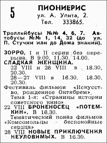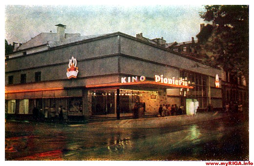 Пресса писала: «Сегодня, в 40 годовщину пионерской организации имени В.И.Ленина, рижские школьники получат чудесный подарок – широкоэкранный кинотеатр «Пионерис». Там, где несколько дней назад еще работали маляры, стекольщики, столяры и электрики теперь звучат звонкие детские голоса. На торжественном открытии кинотеатра «Пионерис» демонстрировался фильм «Девчонка, с которой я дружил» (режиссер Н.Лебедев, Ленфильм, 1961).