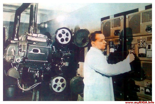 Один из лучших киномехаников Латвии Роман Келпш подготавливает аппаратуру для очередного киносеанса в кинотеатре «Комъяуниетис» (1952 год) – фото Ж.Легздиня.