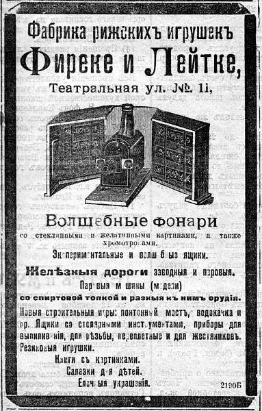 Волшебные фонари были очень популярны. Для домашнего пользования их производила рижская игрушечная фабрика «Фиреке и Лейтке», расположенная на Митавском шоссе (ул. Виенибас Гатве) 9. Приобрести волшебный фонарь можно было в магазине игрушек в доме №11 на Театральной улице.