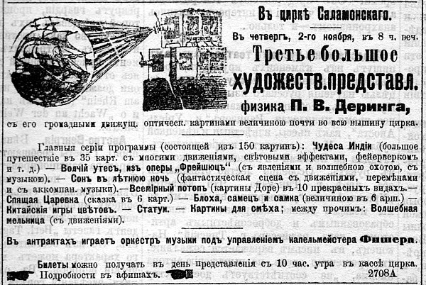Своего апогея сеансы «живой фотографии» в Риге достигли осенью 1895 года, когда уже известный рижской публике по своим предыдущим представлениям в здании Немецкого ремесленного общества физик Пауль Деринг [P.W.Döring] демонстрировал в цирке А.Саламонского (нынешний Рижский цирк) «движущиеся световые картины». На этот раз, как отмечала пресса, картины были значительно улучшены и вызвали доселе невиданный интерес публики. Первый оптический вечер световых картин Деринга в Риге состоялся в воскресенье, 29-го октября.