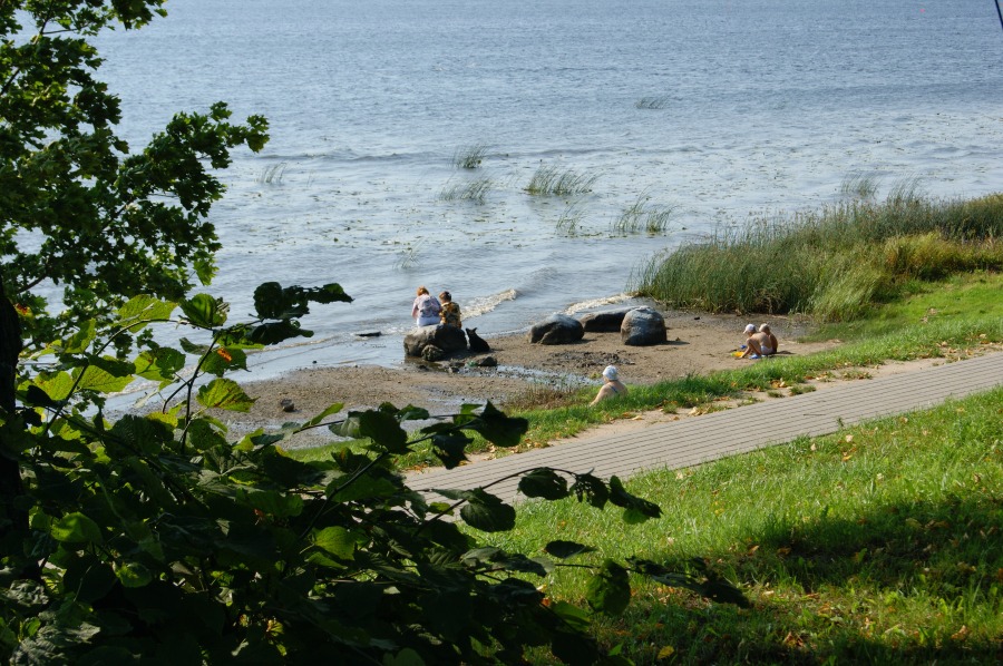 Сама дорожка идёт по дамбе, а внизу, у реки на траве можно загорать.