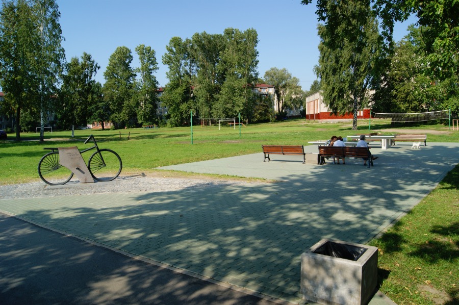 У 51 средней школы устроили площадку для отдыха со столами для игры в пинг-понг и поставили памятный знак в виде велосипеда.