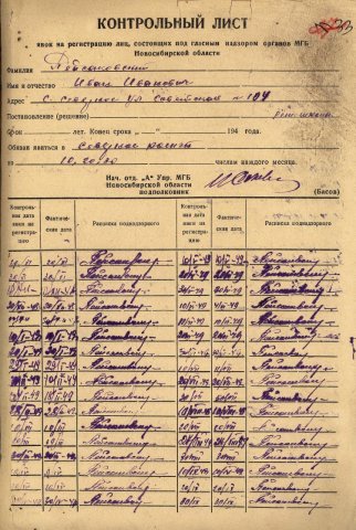 Проживая в поселении, ссыльному необходимо было в определенные сроки регистрироваться в спецкомендатуре, для чего существовали специальные контрольные листы. Ниже представлен один из таких листов.