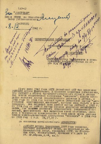 Вот содержание одного из таких обвинений: «Обвинительное заключение по следственному делу №2306. По обвинению: Ранцанс Антонс Тадеушовича в преступлениях, предусмотренных по ст. 58-п.4 УК РСФСР. 11-го июня 1941 г. НКГБ ЛССР был арестован Ранцанс Антонс Тадеушович. В процессе следствия установлено, что Ранцанс в период буржуазно-фашистского строя в Латвии был членом студенческой корпорации «Лакуанша». Будучи враждебно настроен против революционного движения в Латвии, с 1925 года по 1934 год состоял членом фашистской партии «латгольских христианских крестьян», которая вела борьбу с коммунизмом. Как активный член данной партии Ранцанс с 1925 г. по 1934 год от данной партии являлся депутатом латвийского сейма, где занимал должность председателя ревизионной комиссии, одновременно был министром путей сообщения. Находясь в буржуазном правительстве в то же самое время состоял членом военно-фашистской организации «айзсарги» с 1934 г. по 1935 год (л.д. 14, 17, 15). На основании вышеизложенного ОБВИНЯЕТСЯ: Ранцанс Антонс Тадеушович, 1897 года рождения, уроженец людзинского уезда, из крестьян, по национальности латыш, гражданин СССР, по профессии врач, беспартийный; проживал в г.Риге по ул.Кр.Барона, д.64, кв.1. В ТОМ ЧТО являлся членом латвийского буржуазного правительства и состоял в нескольких контрреволюционных организациях в том числе в военно-фашистской организации «айзсарги». Т.е. в преступлениях предусмотренных ст. 58 п.4. Виновным себя в контрреволюционной деятельности не признал (л.д. 19). Руководствуясь ст. 208 УПК РСФСР следственное дело №2306 по обвинению Ранцанс Антонс Тадеушович направить на рассмотрение Особого Совещания НКВД СССР. Оперуполномоченный РО НКВД ЛССР Берзиньш».