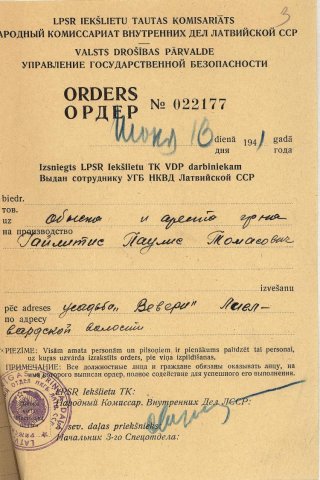 На фото: Ордер на обыск и арест гражданина Гайлитиса Паулиса.
