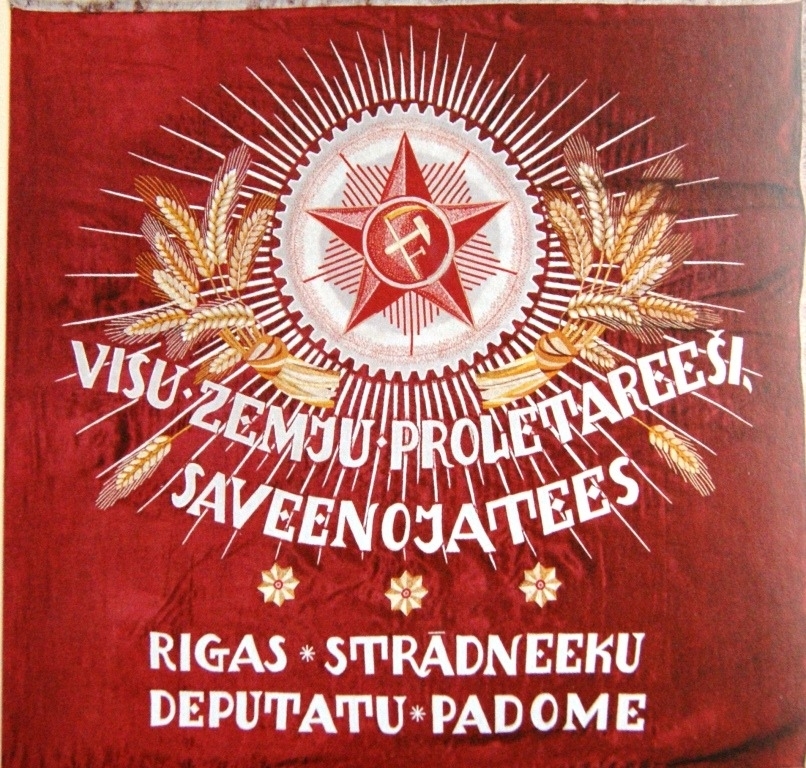 В водовороте Первой мировой войны утонули многие городские традиции, в том числе и городской флаг. В 1919 году в Риге ненадолго установилась советская власть. У городского совета рабочих депутатов появилось своё знамя. Как и положено советскому флагу он был красного цвета с лозунгом «Пролетарии всех стран объединяйтесь». Специально для совета депутатов латвийский художник Ансис Цирулис создал эмблему, которую тоже можно увидеть на рижском флаге того времени. Это звезда и несколько необычный символ единства рабочих и крестьян. Вместо привычного нам серпа вместе с молотом на нём красуется коса. Век этого флага, равно как и век Латвийской Социалистической Советской Республики оказался недолог.