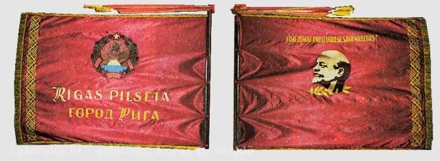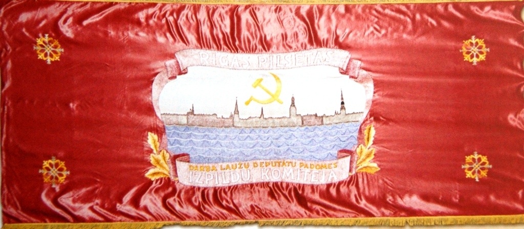 Не прошло и десяти лет, как и этот флаг положили на полку. Новой советской Риге нужен был совершенно иной, патриотический флаг. В первой половине 1950-х годов появился флаг Исполнительного комитета рижского совета рабочих депутатов, выполненный по рисунку К. Янсона. Красное знамя было украшено золотистыми орнаментами в национальном духе, а посреди флага виднелась панорама Риги и парящие над ней серп и молот. Что интересно, в городском силуэте угадывается шпиль церкви Св. Петра, хотя в то время храм лежал в руинах.
