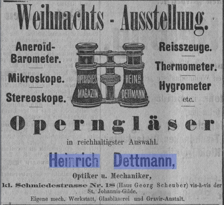 Это здание далеко не самое старое в городе, но именно ему было суждено стать самым дорогим домом Старой Риги. Речь идёт о строении на ул.Тиргоню, 4. Когда-то его построил для своего магазина купец второй гильдии, гражданин германской империи оптик Генрих Деттман. На заре своей карьеры он владел небольшим магазинчиком на улице Мейстару, недалеко от Малой Гильдии. В этой лавке можно было купить разнообразные оправы: золотые, роговые, никелированные, в общем, какие душе угодно. Были в ассортименте и различные оптические приборы: микроскопы, стереоскопы и бинокли. Кроме этого Деттман продавал термометры, барометры и другие приборы, при магазине работала небольшие стекольная и механическая мастерские. Но прославился Генрих вовсе не этим.