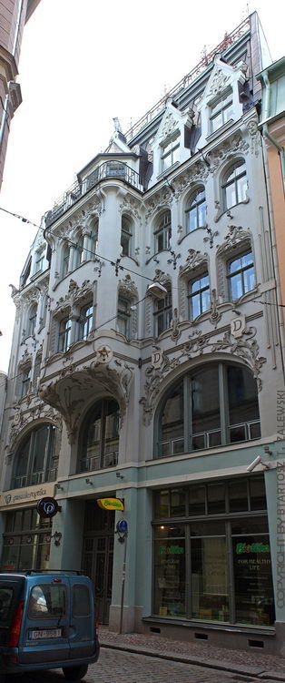 Увы, но насладиться своими домом Деттману не довелось, спустя год после окончания строительства он умер. Ему было всего 46 лет. Не увидел он и завершение его второго детища. Дело в том, что участок, который он когда-то купил у Крейша, выходил ещё и на улицу Шкюню. Здесь уже были заложены фундаменты второго крыла здания. На этот раз проект полностью разрабатывали Шель и Шеффель. Это настоящий шедевр югендстиля. Это здание устроено так же, как и корпус на Тиргоню: два нижних этажа и подвал отданы под магазин, а наверху располагаются квартиры. Весь фасад здания был оштукатурен и украшен настоящим цветником из камня: размашистые каштаны, извивающиеся словно змеи маки, скромные нарциссы и стройные, как оловянные солдатики, колосья заполняют пространство между окон здания. И снова на фасаде появляются кованые цветы и решётки. На небольших декоративных щитах размещена латинская буква «D» – так потомки увековечили имя Генриха Деттмана.