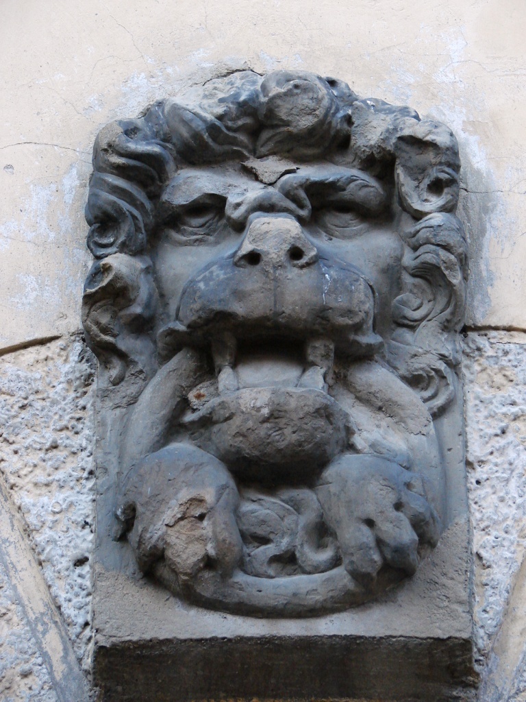Со стороны ул. Майса в стену «Нейбурга» вмурован интересный рельеф: маска льва с кольцом в зубах. Когда-то такой же рельеф украшал арку городских Штифторских ворот, которые находились в районе современной улицы Бискапа Гате. Эти ворота несколько раз перестраивались и до наших дней не сохранились. Во время одной из перестроек с ворот сняли небольшую фигурку монаха и этот самый рельеф. Оба артефакта попали в руки ратмана Петерсена и украшали его дом, а затем попали в Музей истории Риги. Скульптурка монаха, как символ Реформации, получила известность, о ней писал сам Бротце и теперь она выставлена в экспозиции, а вот рельефу со львом не повезло. Сначала его вмуровали в стену здания во дворе музея, но там за ним никто не следил и изображение постепенно разрушалось. Известный своей любовью к архитектурному прошлому Риги Бокслаф пытался спасти рельеф, но вынуть его из стены не представлялось возможным, и тогда по его проекту была изготовлена копия, которую мы можем найти на улочке Майса.
