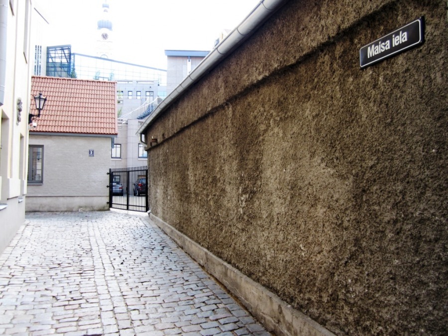 Отдохнув от суеты современного города в спокойной атмосфере улочки Акла, отправимся в последний рижский тупичок – это улица Майса, или Мешочная. Сегодня это небольшой переулок на улице Яуна. Своё название он официально получил в 1930-х годах, до этого просто именовался тупиком, по-немецки «Sackgasse». На этой улочке есть один единственный дом – но это творение XXI века. Тем не менее и в этом «мешке» есть своё сокровище. Одну из сторон улицы занимает здание отеля «Нейбург». Его автор, архитектор Вильгельм Бокслаф, сохранил в его облике часть рижского прошлого.