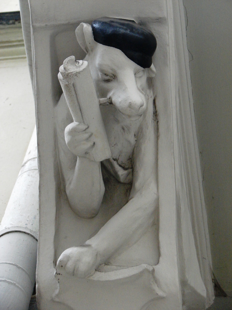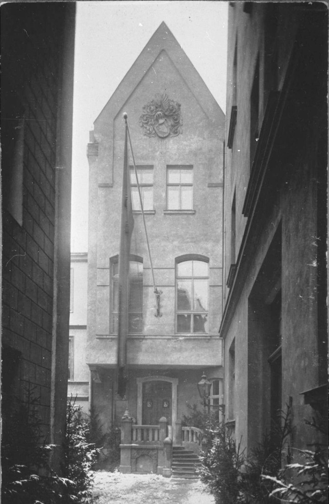 С улицы видно небольшое крыльцо, нарядные двери и высокие окна второго этажа. Если подойти ближе, то на консоли, поддерживающей нависающий над крыльцом эркер, можно увидеть скульптурку лиса в шапочке корпоранта с дипломом в руке. Это не случайно: самых младших членов корпорации, которые только что закончили гимназию и начали учёбу в университете называют «фуксами». На немецком фукс – это лиса, так и повелось, что хитрый лис стал символом самых младших корпорантов. Прямо с небольшой площадки перед зданием можно попасть в подвал, где была оборудована отдельная комната для самых старших членов «Concordia», филистров, так называли тех корпорантов, что уже окончили университет, ведь членство в организации зачастую длилось всю жизнь и филистры играли в жизни корпорации очень важную роль.