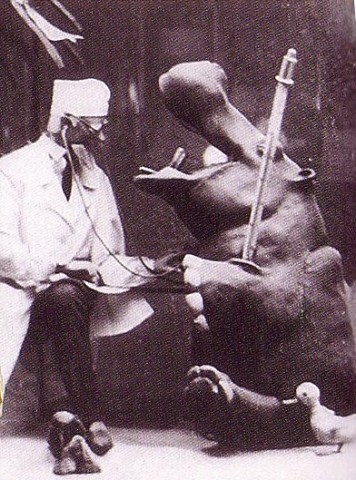 Таким в начале 60-х годов был доктор Айболит – герой одноимённого стихотворения популярного русского писателя Корнея Чуковского. В стихотворении доктор отправился в Африку, чтобы помочь тяжелобольным зверям. Сохранилось описание этой первой движущейся рекламы, которое позволяет оценить степень сложности подобных проектов. Реклама состояла из двух фигур – больного бегемота и врача. Всего было несколько движений: сначала доктор сидел и слушал через фоноскоп дыхание бегемота (он открывал рот, и грудь начинала ритмично двигаться); затем доктор наклонялся, а бегемот открывал рот и ждал, когда доктор закончит осмотр. В конце доктор брал в руку лапу бегемота и смотрел на часы, по движениям его губ можно было понять, что он считает пульс.