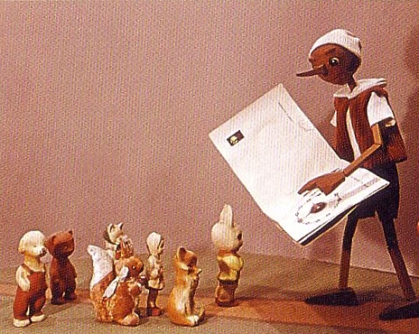 Не менее популярным был герой сказки Алексея Толстого деревянный мальчик с длинным носом – Буратино. Адриан Пабиан создал в своей рекламе «Театр Буратино» четыре сцены. В них Буратино встречался с другими героями сказки. Так в одной сцене Мальвина качала головой, когда Буратино, сидя за столом лизал тарелку языком, а на второй картине злой Карабас Барабас пытался поймать Буратино, но его борода приклеивалась к дереву и деревянному мальчику удавалось улизнуть.