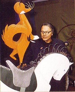 Адриан Пабианс у фигуры лисицы на лошади из витрины "Цирк".