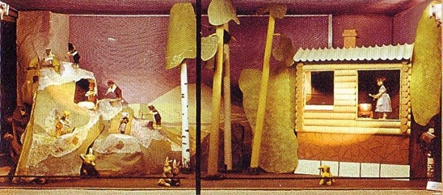 Не менее интересной была и следующая инсталляция «Белоснежка и семь гномов». Перед зрителями представал горный пейзаж. Справа среди деревьев стоял бревенчатый домик гномов с двумя окошками. В одном из них виднелась плита и Белоснежка, которая готовила обед. Слева в горах работали семь гномов.