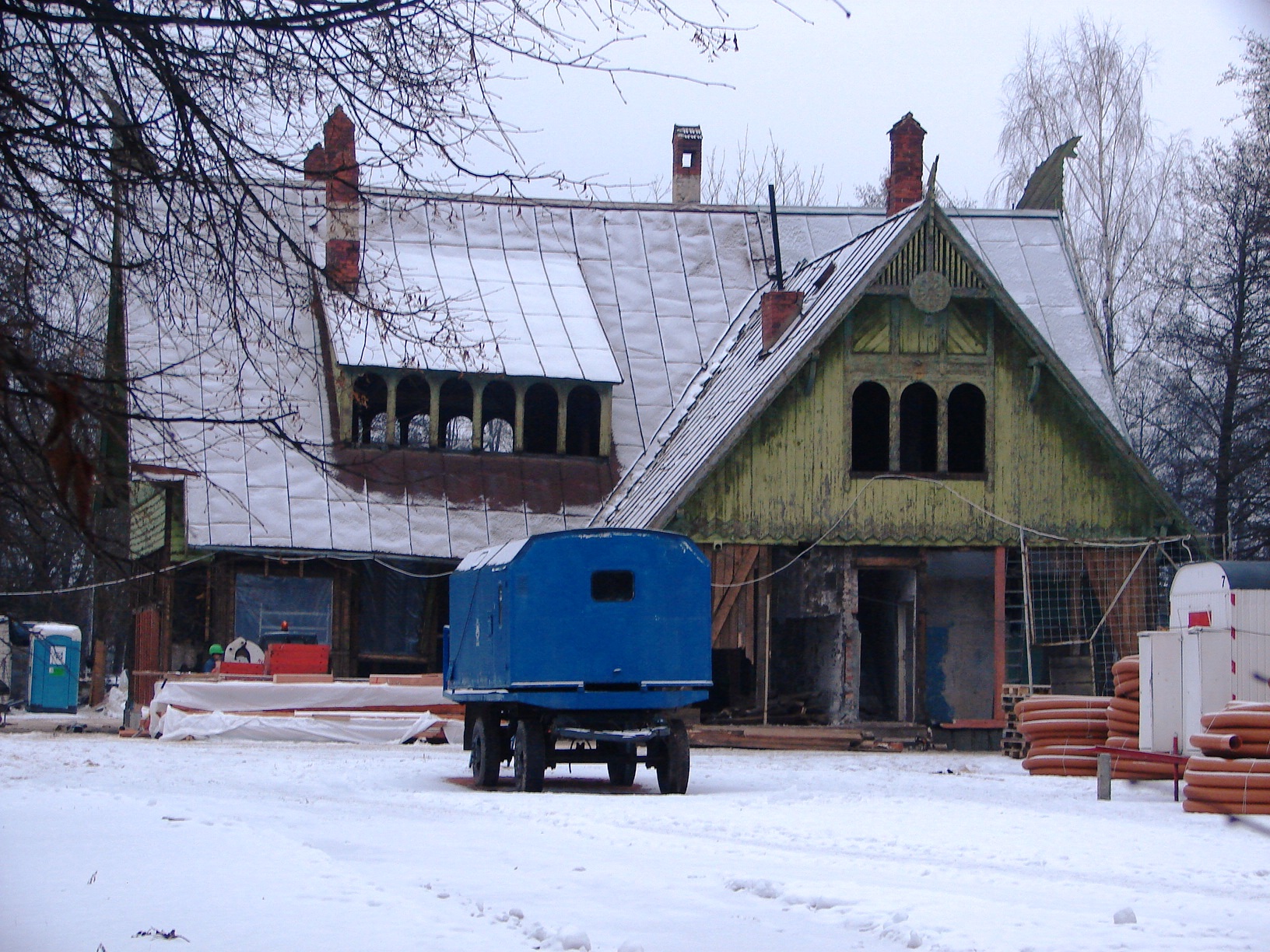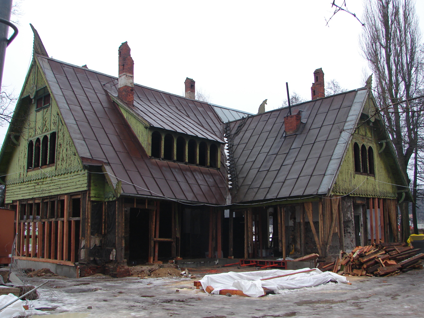 Уже разобрали все нижние перекрытия и стал виден каркас здания. Разобрали и пристройку. Видно, что зданию необходим ремонт. Краска фасада облупилась, перекрытия и стены в плохом состоянии, драконы на крыше грозят вот-вот рухнуть.