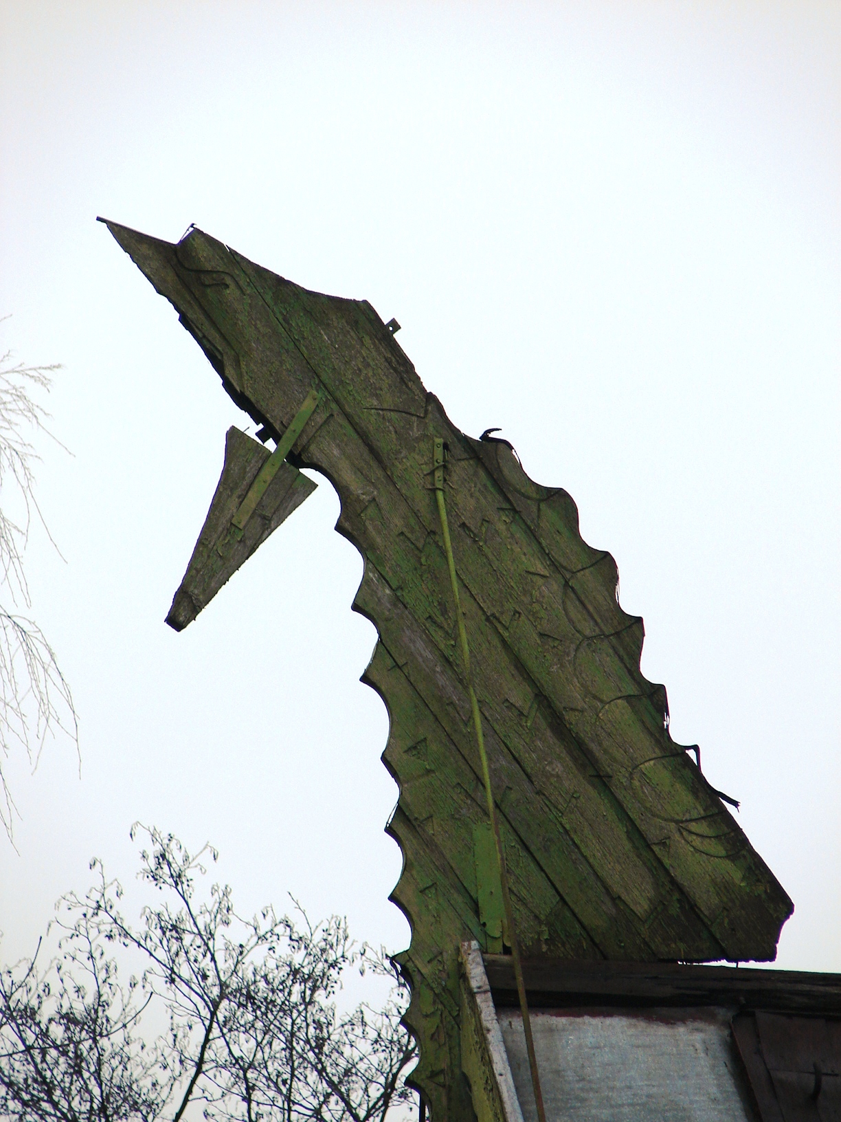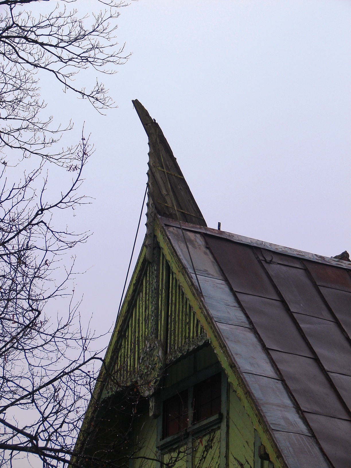 Прошло время и здание изменилось. Его форма и содержание остались – это по-прежнему было здание спортивного общества. Однако скандинавские драконы на его коньках опустили свои морды. Если присмотреться ко второй фотографии, то видно, что на голове дракона вырезаны чешуйки, а у верхушки головы вырезан глаз. Я, когда был маленький, всё время думал, что морда дракона – это выступающая на подобие клюва треугольная часть.
