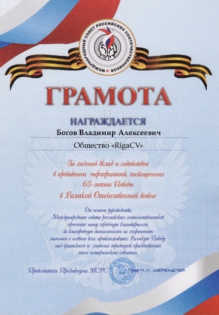 23 ноября в рижском Доме Москвы состоялось награждение почетными грамотами активистов разных общественных организаций Латвии за личный вклад и содействие в преведении мероприятий, посвященных 65-летию Победы в Великой Отечественной войне.