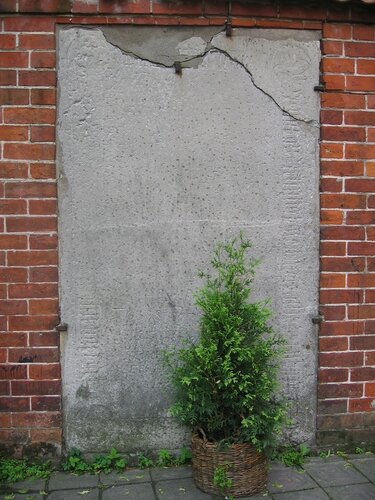 Стену с надгробными плитами к счастью почти обошли своим внимание любители настенной надписи и живописи. Только на одной из плиты какая-то надпись. Её не убирают. Почему? Не видят? Некому? Нет дела? Или это специально поставленная надпись?