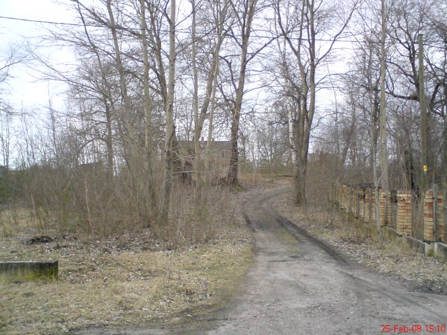 Ул. Lizuma. Мы пересекли железную дорогу, прошли вдоль каменной ограды Нового еврейского кладбища. Началась железная ограда. Вот тут слева и находилась вырубленная ныне роща. Там, где белеют автомашины – Ozolkalns (Eichenberg).
