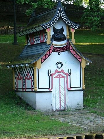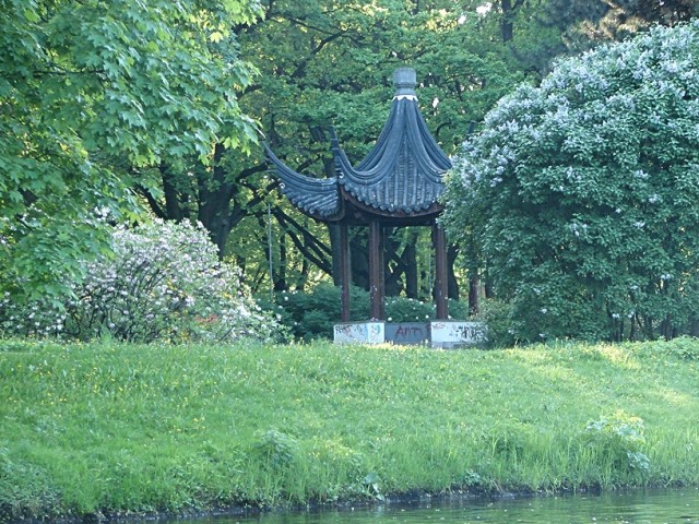 А напротив, как будто другой мир,- беседка, подарок из Китая к 800-летию Риги.