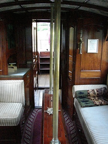 В салоне диванчик с круглыми пуфиками и два креслица, между ними — раскладной столик с пепельницей в виде штурвала.