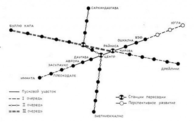 Давайте представим себе, что в 1988 году всё таки началось строительство рижского метрополитена. К 1996 под Ригой уже появились бы станции первого участка метро от станции "Засулаукс" до завода"ВЭФ". Вот схема рижского метро.