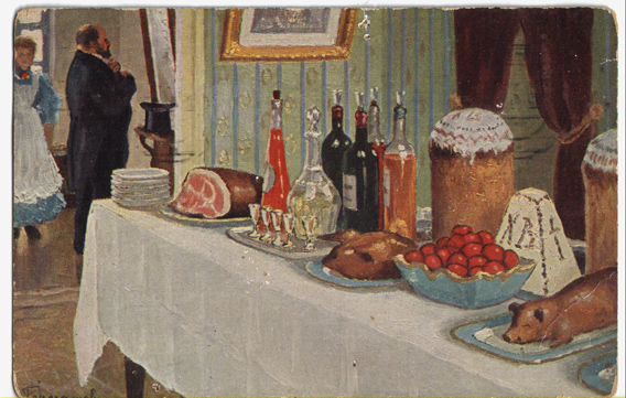 Здесь были и куличи, и пасха, и крашенные яйца, и мясо, и спиртное — пост закончился, можно отвести душу.