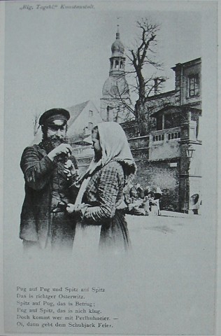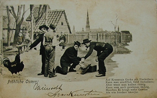 После обильных кушаний можно было пойти погулять. С собой рижане брали крашеные яйца и играли со всеми- домашними, соседями, просто встречными в весёлую игру — битву яйцами. Понятна эта игра была не всем, поэтому издавались специальные открытки и на эту тему.
