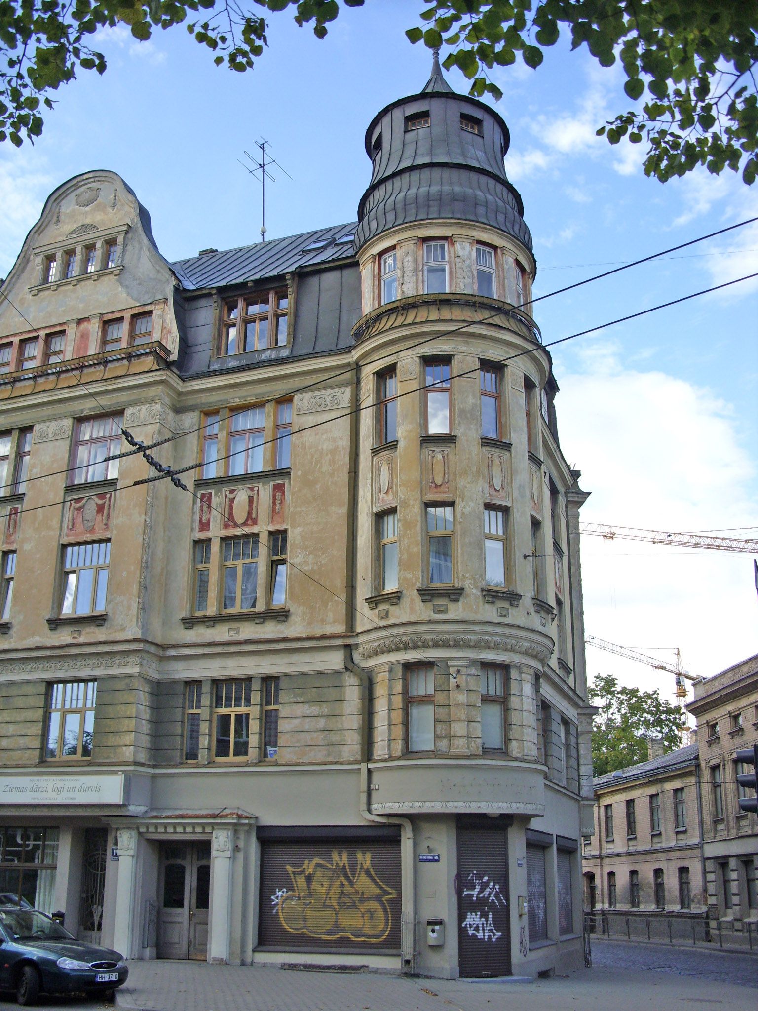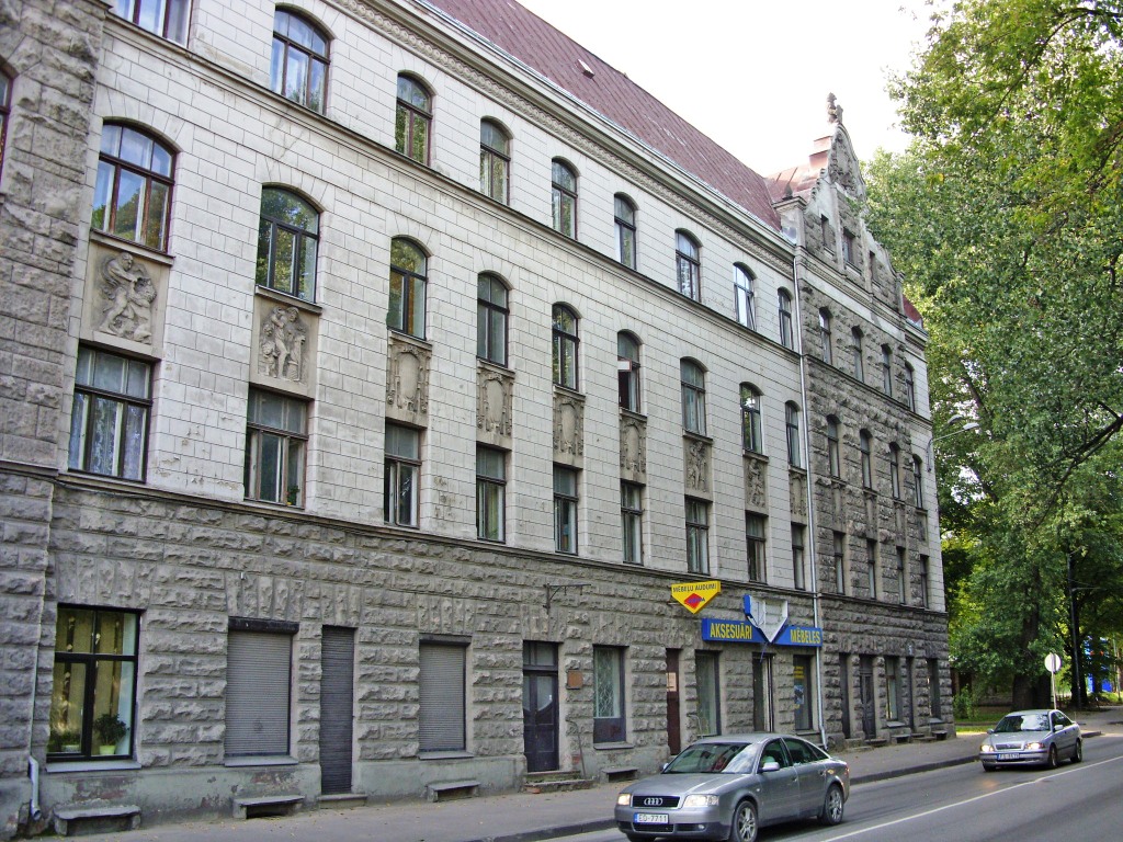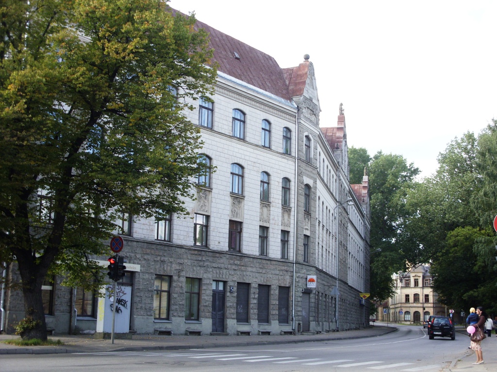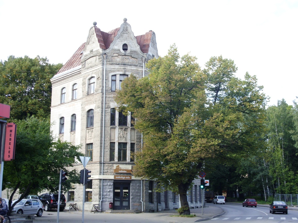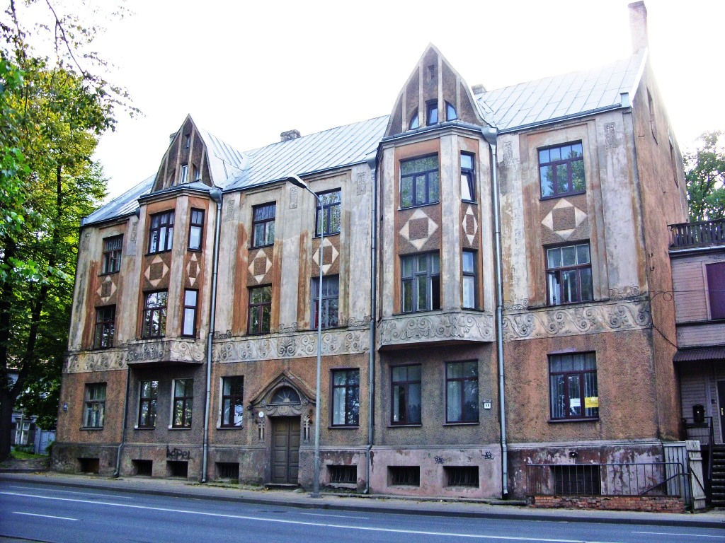 С четной стороны ее открывает многоэтажный доходный дом в стиле вертикального модерна на углу улицы Калнциема.