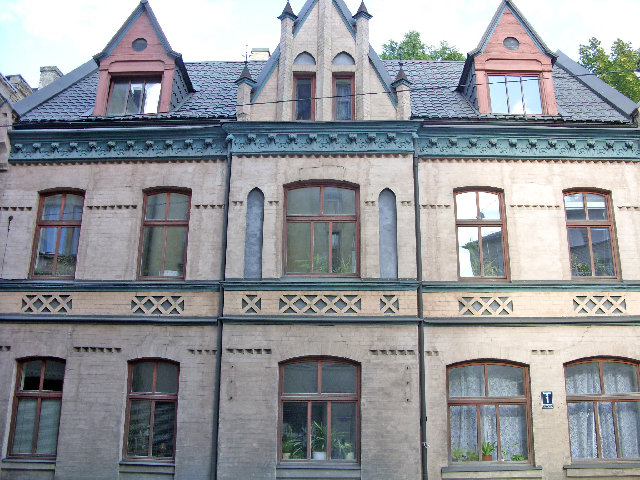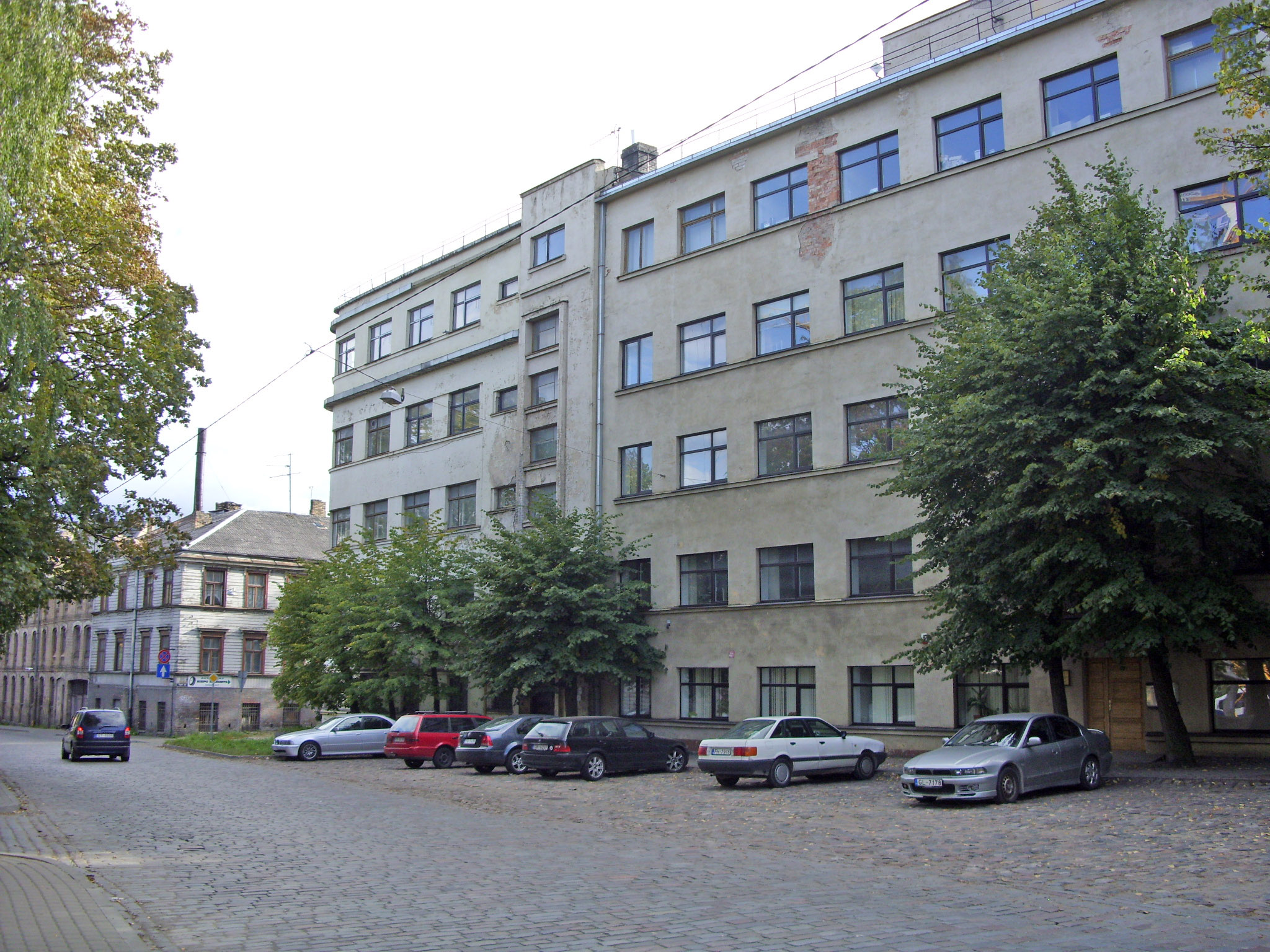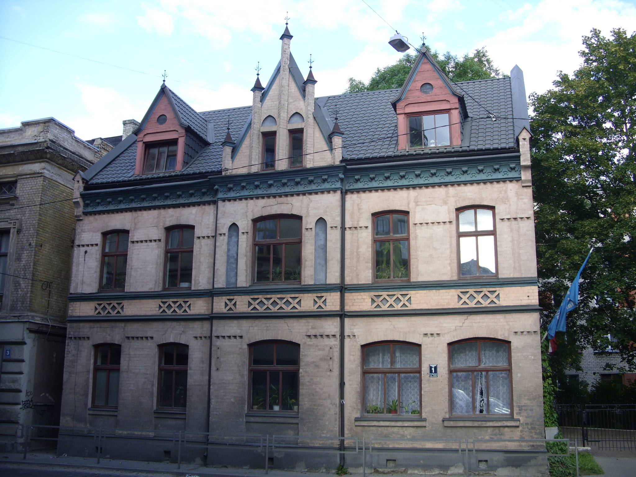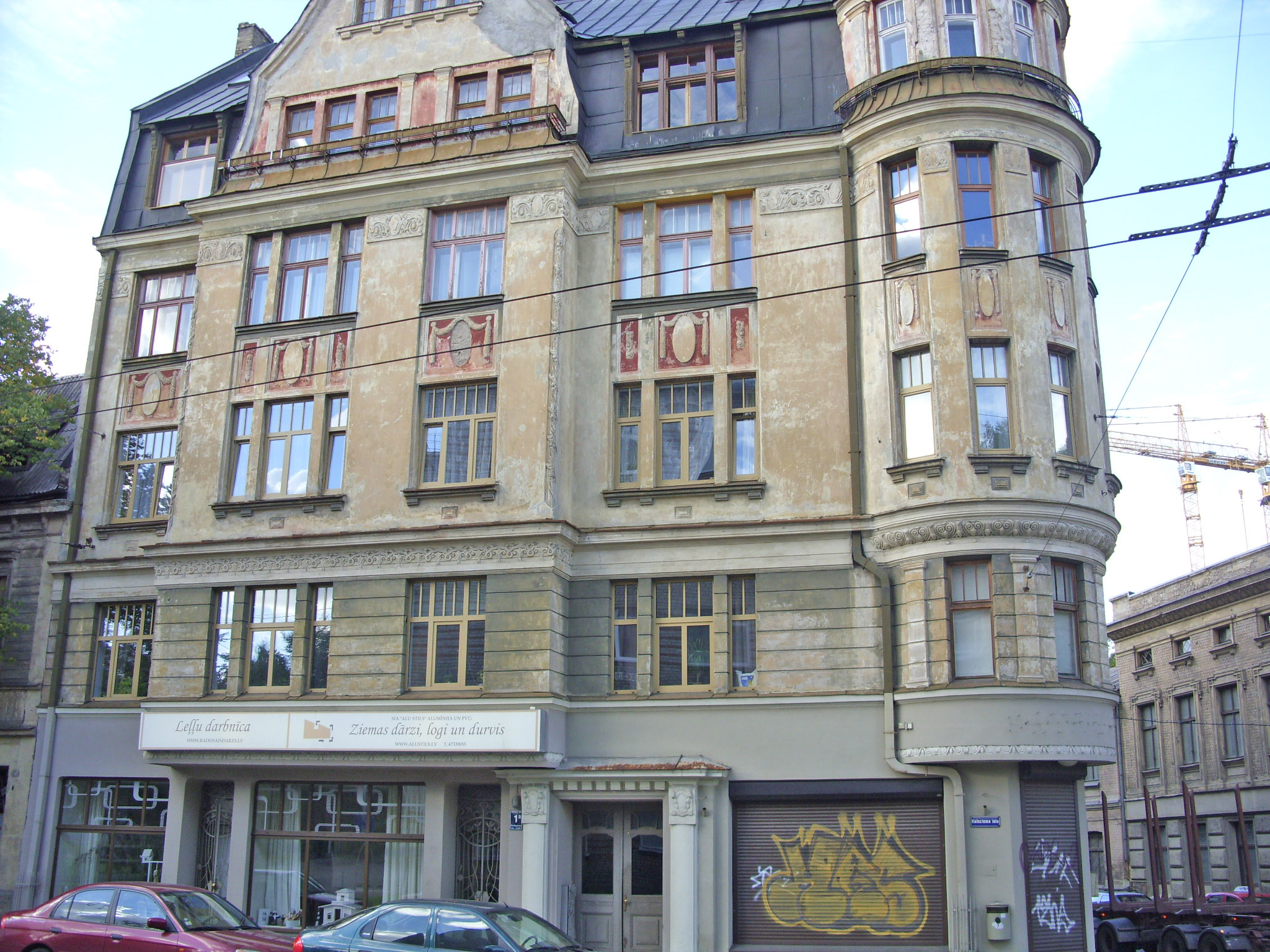 С четной стороны ее открывает многоэтажный доходный дом в стиле вертикального модерна на углу улицы Калнциема.