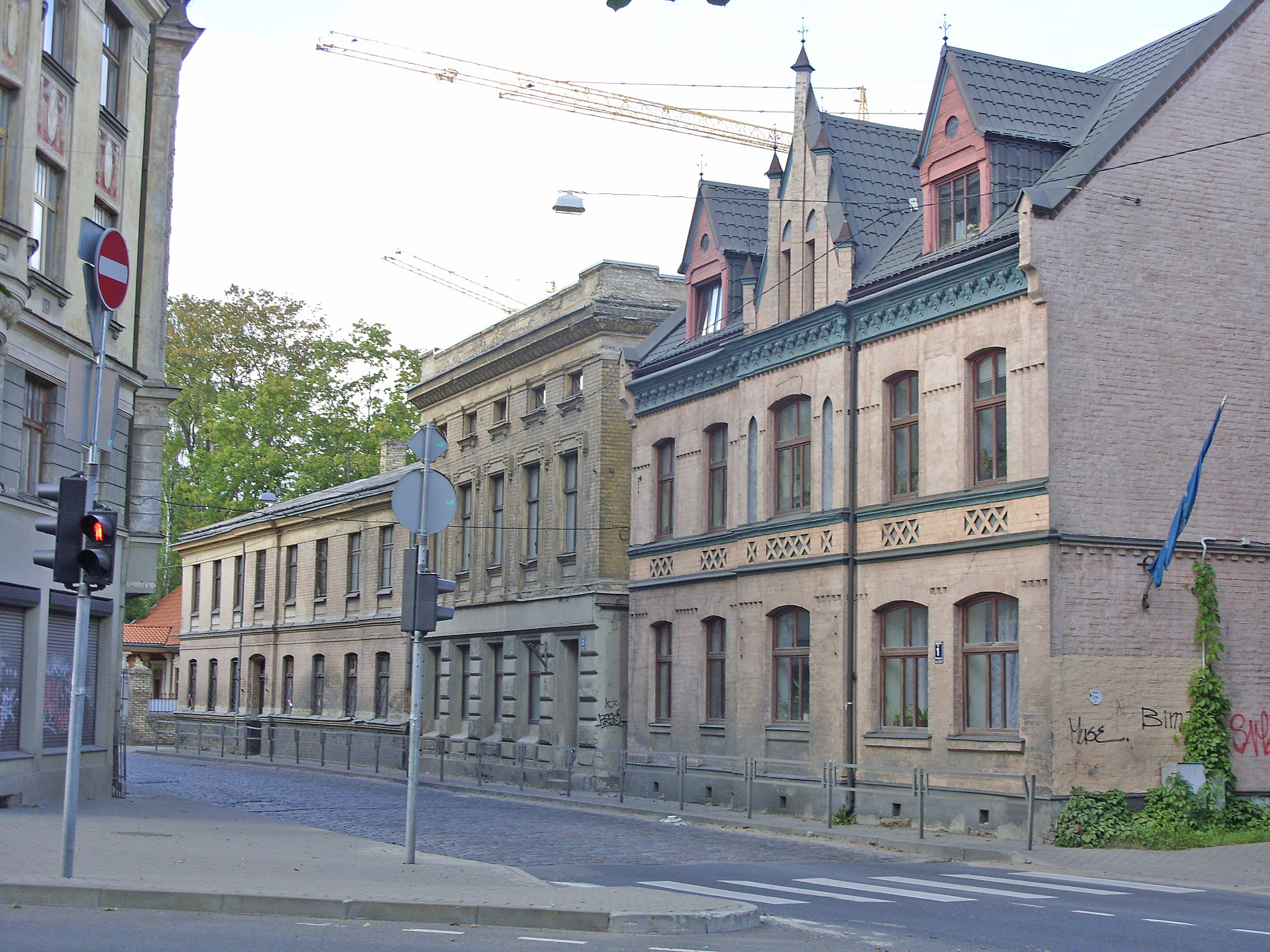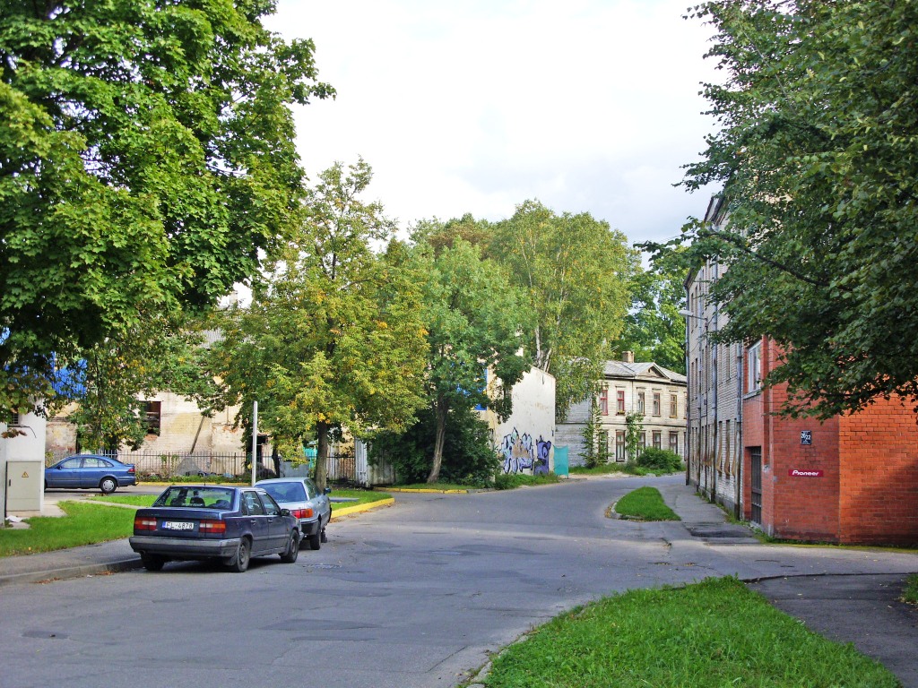 Здесь улица уже значительно шире. Заглянем на минутку в створ улицы Уденс, уходящей мимо кожевенной фабрики Эриня (справа) к бывшему мебельному комбинату.