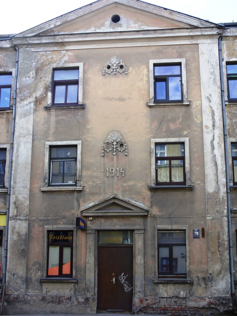 Судя по дате — ровесник Первой мировой. Сейчас фасад сильно запущен и нуждается в ремонте