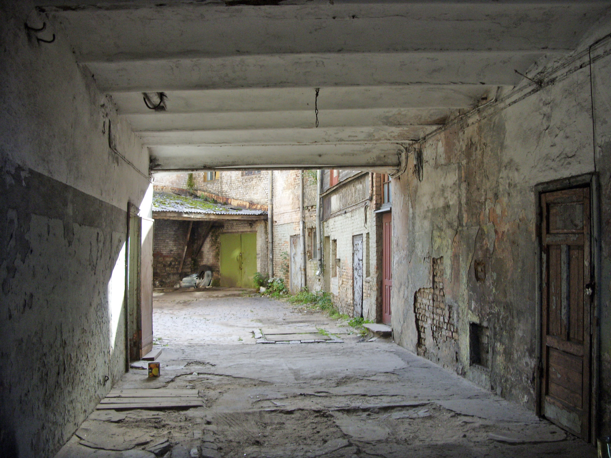 Внутри — треугольный, неожиданно тесный двор с угольным навесом. А вход на лестничные клетки — из подворотни