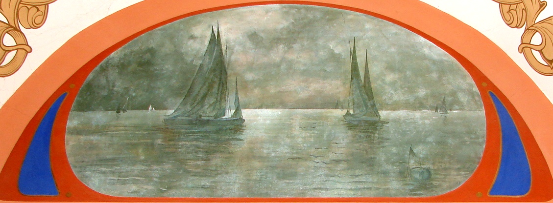 Из всех залов биржи этот производит самое благоприятное ощущение. На потолке и стенах богатая лепнина с изображением птиц и крылатых гениев.