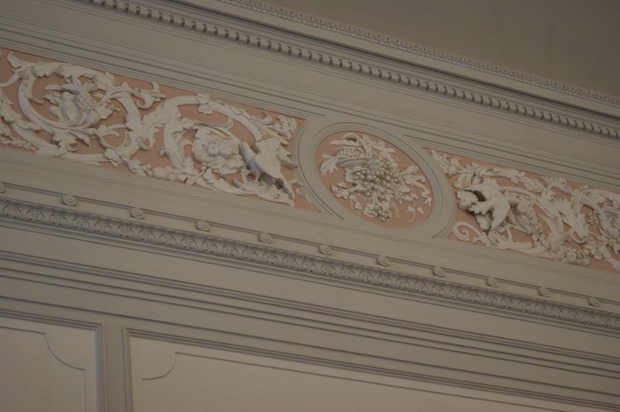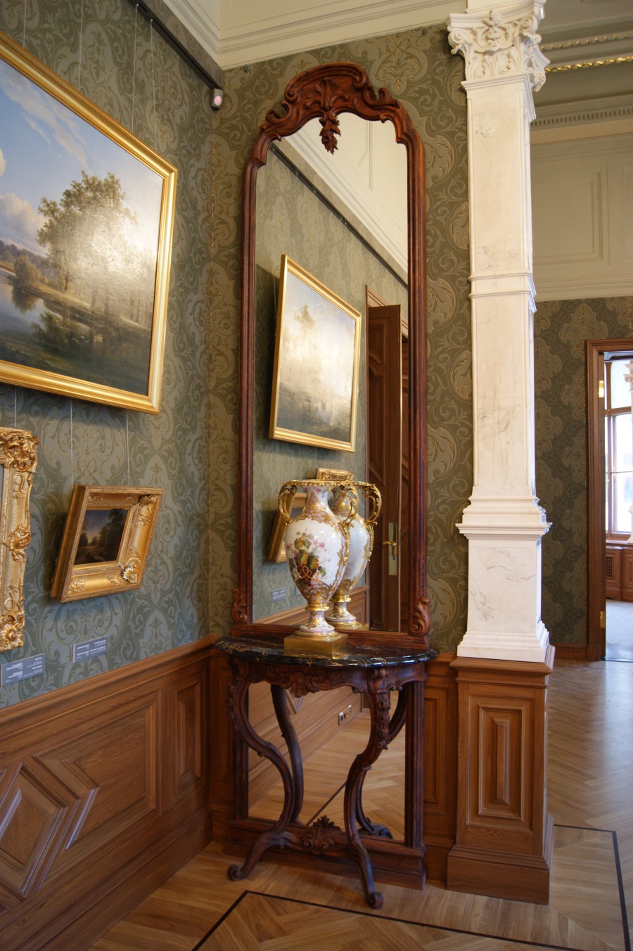 Увы, но рассмотреть их детально мешает система освещения. Когда-то тут проходили все торжества биржевого комитета, теперь же зал перегорожен, но здесь всюду развешаны картины и впечатление помещение оставляет более приятное, нежели колонный зал.